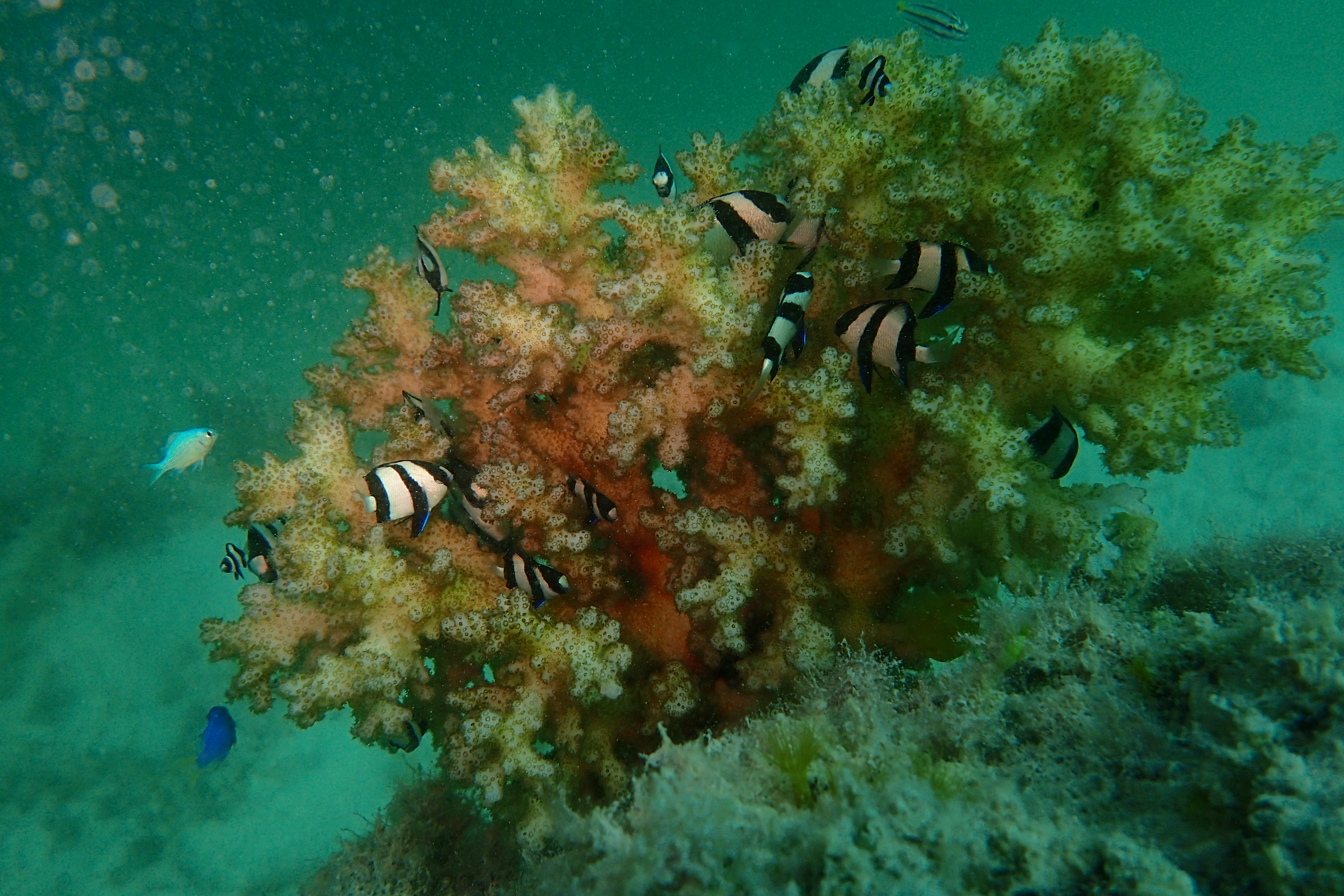 洞壁上凡是有珊瑚礁生长的地方,都是生机盎然。各种各样的鱼类在珊瑚礁中钻进钻出,忙着躲闪到访的客人,很多是珊瑚礁海域常见的种类,如小丑鱼、狮子鱼、短吻鼻鱼、鹦嘴鱼等。