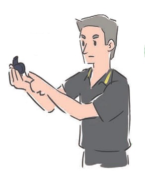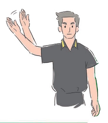 注解:以前曾有进攻队员趁防守队员还没有准备好就发出任意球,从而破门得分的事例。现在,球员需要听到裁判的哨声后才能发出任意球,这时候裁判就会用这种手势表示“听我哨声行事”。如果有人不看手势,提前发球,那么等着他的将是黄牌。