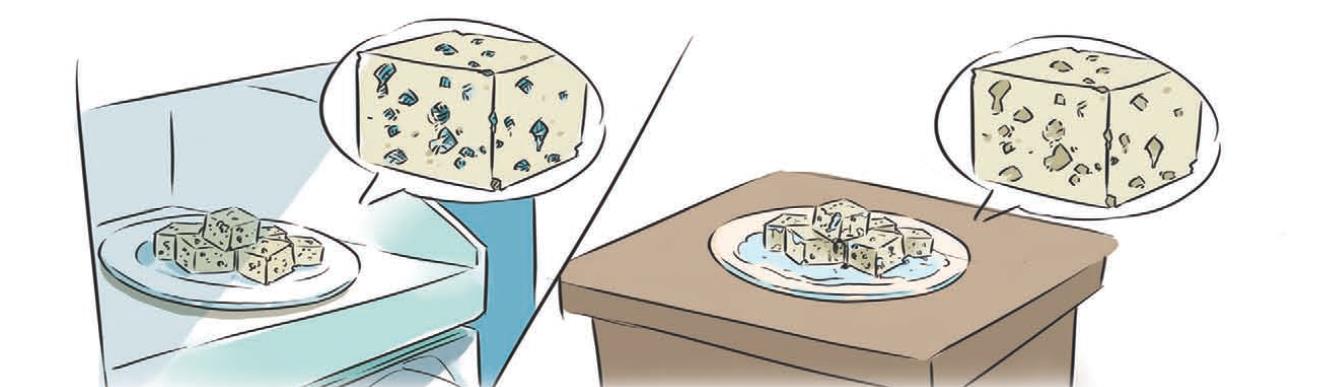 A:豆腐富含水分,在冰冻的过程中,内部的水会结冰。水结冰后体积会膨胀,一颗颗小冰碴儿就会挤出一个个小洞。解冻后,冰又化成了水,但那些密密麻麻的小洞却再也无法复原,于是就留下了许多小孔。