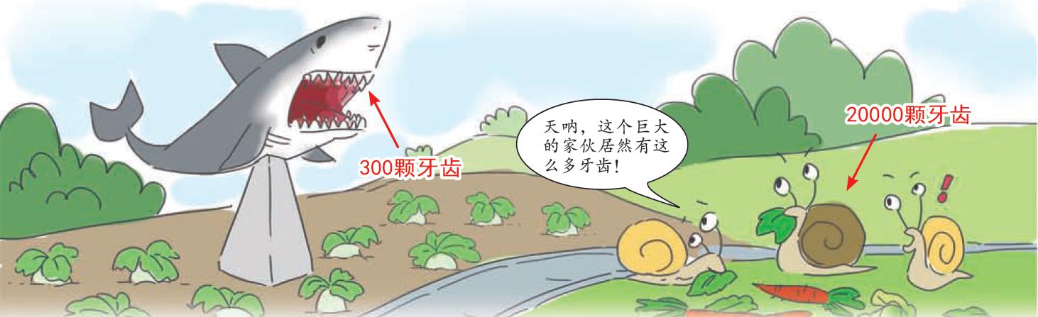 A:说到牙齿多的生物,人们往往会想起鲨鱼,部分种类的鲨鱼能有多达300颗牙齿。然而在蜗牛面前,鲨鱼可以说是小巫见大巫了:蜗牛有超过20000颗牙齿,这些牙齿密密麻麻地排布在蜗牛的“舌头”上,就像锉板一样能把食物磨碎,方便吞咽。