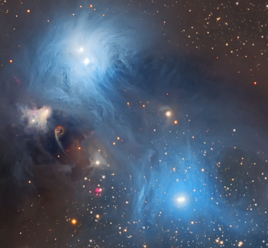这些蓝色的丝丝缕缕,给影像增添了几分梦幻色彩。照片拍摄的是南冕座中的一片区域,其中的尘埃云遮挡住了银河中遥远背景恒星的光。这里三个明亮的反射星云(NGC6726,NGC6727,IC4812)闪耀着蓝色的光芒,这是因为附近的气体尘埃反射了星云中明亮的蓝色恒星所发出的光。