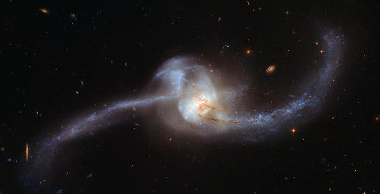 这个星系对的编号是Arp243,星系的碰撞使得星系内的气体尘埃被压缩、搅动,从而促成了大量新生恒星的诞生,因而我们可以在画面中看到很多蓝色的光点。在引力的作用下,气体尘埃被扭曲、拖拽,形成了长长的拖尾。