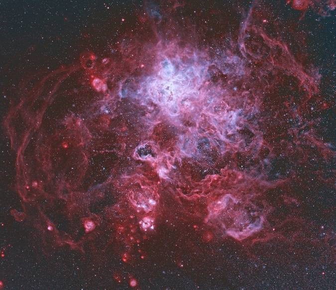 从地球上看,这个星云位于剑鱼座天区,距离我们地球大约十八万光年远。星云内部大量炽热的大质量恒星组成了星团,发出强烈的辐射、恒星风和冲击波。在冲击波的作用下,原子发生受激辐射,产生图中这些特别的颜色,尘埃气体则变成了丝丝缕缕的结构。