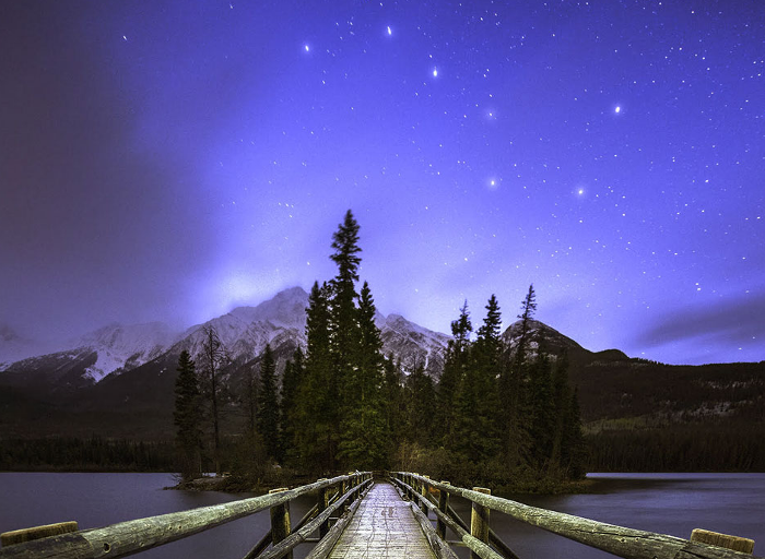 这幅照片拍摄的是加拿大金字塔山上空的北斗七星。在不同的民族文化中,北斗七星都是北天极附近最显著的星象之一。由于它的形状好似一个巨大的勺子,因而也有人叫它勺子星。中国古人称其为北斗,是因为它很像殷周时期的酒斗。这种酒斗与称量粮食的斗有所不同,它有着长长的柄,也是为了方便舀酒。