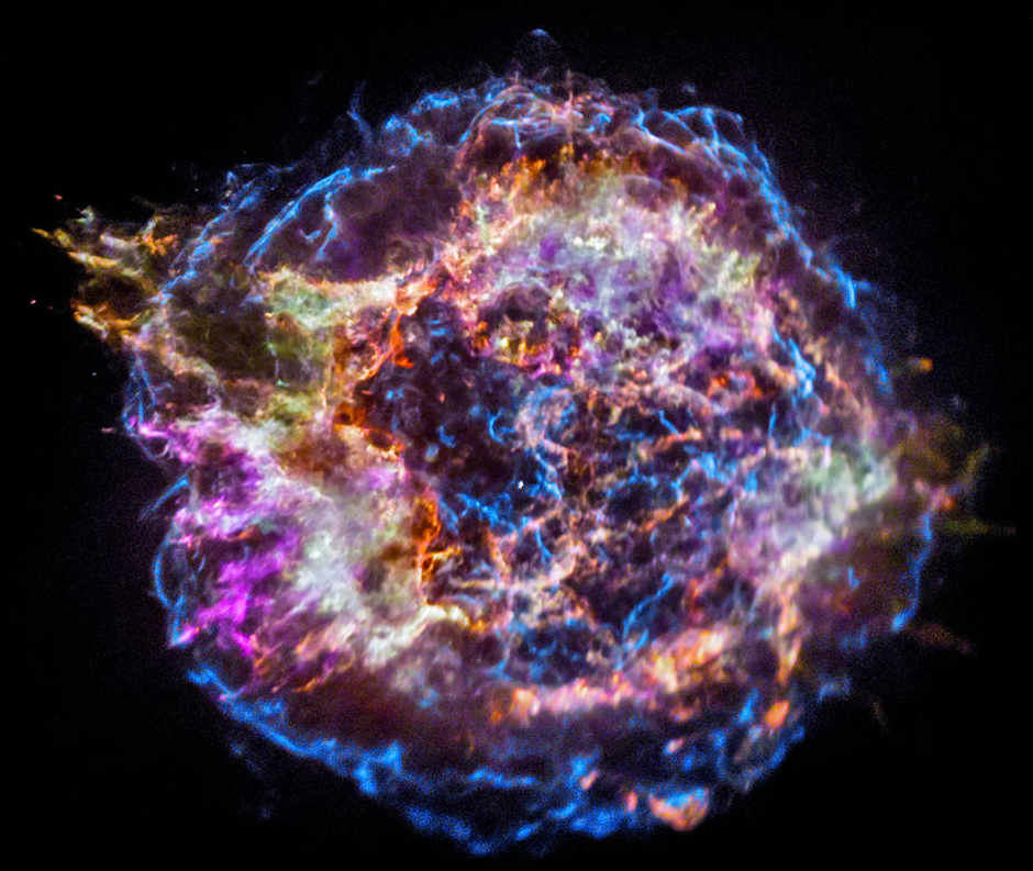 构成地球生命的元素大多来自哪里?答案可能会让你有点吃惊:它们来自宇宙恒星的熔炉之中,来自恒星生命结束时的爆发。这幅来自钱德拉X射线天文台的影像,拍摄对象是一个超新星遗迹“仙后座A”(Cas A),画面中不同的颜色标示出不同的元素,红色的是硅,黄色的是硫,绿色的是钙,紫色的是铁,而超新星爆发产生的冲击波构成蓝色的外环。