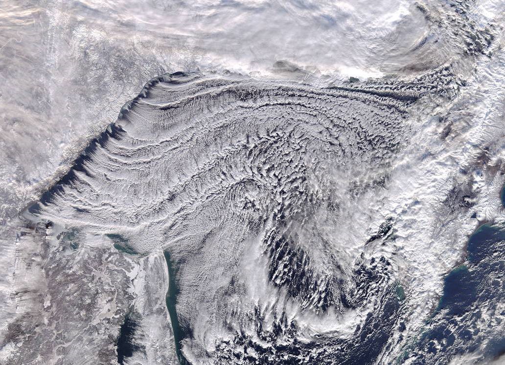 这幅气势恢宏的画作,来自美国航天局地球卫星(Terra)上搭载的中分辨率成像光谱仪。当俄罗斯东部吹来的冷空气经过鄂霍次克海的上空,对流尺度近似的积云在天空中整齐排列开,就形成了这样壮观的景象,气象学上称之为“云街”。