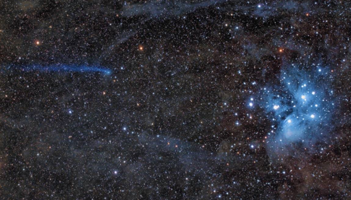 这张照片的右侧是我们大家熟知的昴星团,它是一个反射星云,星云中的尘埃气体反射周围明亮恒星的光,呈现出蓝色。再看照片左侧,似乎有什么东西正在朝昴星团飞去?这是一颗彗星,编号为C/2016 R2。二者虽然出现在一幅照片中,但实际相距甚远。