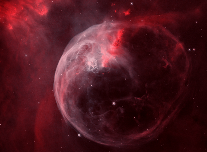 这个泡泡的直径足有7光年,它距离我们地球7100光年远,从地球上看,它位于仙后座天区。“吹”出这个泡泡的恒星是一颗炽热的O型星,我们可以在泡泡中央左上方找到它,这颗星的亮度达到了太阳的数十万倍,猛烈的恒星风加上极强的高能辐射共同造就了这个发光气体泡。