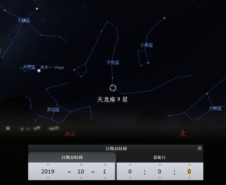对于我国北方大部分地区,这颗恒星是永不下落天体,整晚可以观测。对于我国南方地区,这颗恒星在天黑之后的几个小时之内可以观测到。图1中心的圆圈是由虚拟天文馆软件给出的北京地区在2019年10月1日0时天龙座θ星的具体位置。