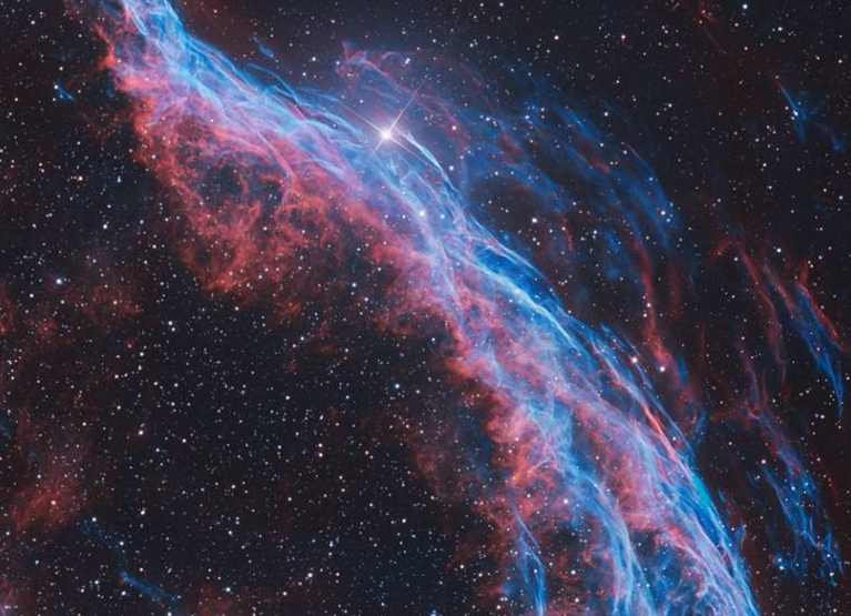 从地球上看,这片超新星遗迹位于天鹅座天区,距离我们地球大约1400光年远。大约一万年前,一颗大质量恒星以超新星爆发的形式结束了壮丽的一生,爆发产生的激波冲击四周的云气,气体因受到激发而发出不同颜色的辉光。其中,红色来自氢气,蓝绿色来自氧气。