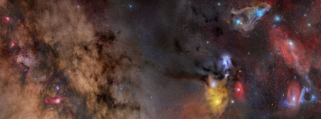 这幅历经长时间曝光的照片,囊括了众多美丽的深空天体。左下角红色云团是礁湖星云M8,其上方紧邻的是三叶星云M20,左上角红色云团是鹰状星云M16。中央偏右的黄色部分是一颗明亮的恒星,它是天蝎的心脏——心宿二,也叫大火。心宿二上方及右上方蓝紫色的是两个反射星云,编号分别为IC4605和IC4604。影像右侧的红色云团是几个发射星云。正因为拥有如此丰富多彩的颜色,这片区域也被称为星空调色盘。
