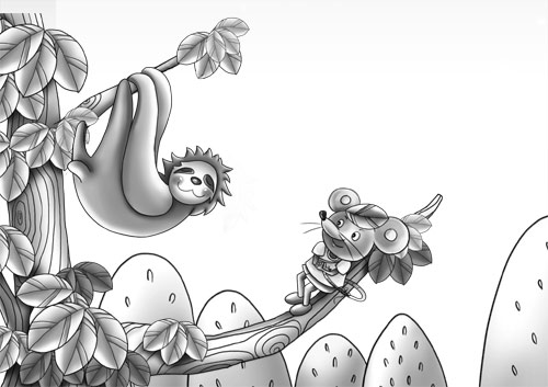 黎明终于到来了。树懒一觉睡了18个小时,现在它坐起来,以太空行走般的慢动作,采下树叶递给彼特儿,邀请它与自己共进早餐。看着彼特儿关切的眼光,树懒微笑着说:“谢谢你的守护,我没病。我们树懒大部分时间都倒挂着,行动缓慢,所以人类叫我们树懒。其实,我们每天睡9个小时就可以了,其他时间我们是在思考。我们虽然是行动的懒汉,却是思想的先驱者。”