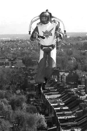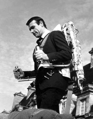 看过美国科幻冒险电影《火箭飞人》的观众,无不佩服片中的超级英雄,他历尽艰险,发现了一种神秘的、可以载人飞行的火箭背包,只要穿着它,就能像鸟儿一样翱翔在天空。这部电影是1991年根据同名科幻连环画《火箭飞人》改编而成的。在2002年的美国科幻影片《少数派报告》中,“预防犯罪局”的警探们都配备了喷气飞行器,随时准备做一回“火箭飞人”。而电影“007”系列之所以会大受欢迎,一是邦德身手矫健,头脑灵活;二是它拥有许多设计巧妙、技术先进的武器。在1965年上映的《霹雳火》中,邦德身背“火箭背包”,一飞冲天,逃离险境的情节,依然让人记忆犹新。