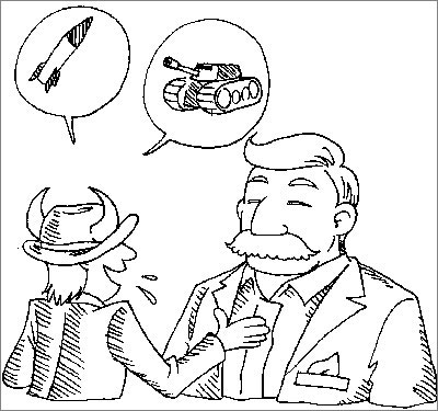 “是呀,就让你的矛式火箭炮打你的盾牌006型坦克吧。我想知道矛式火箭炮能不能击毁什么武器也击毁不了的盾牌006型坦克。这一定很好玩吧?”