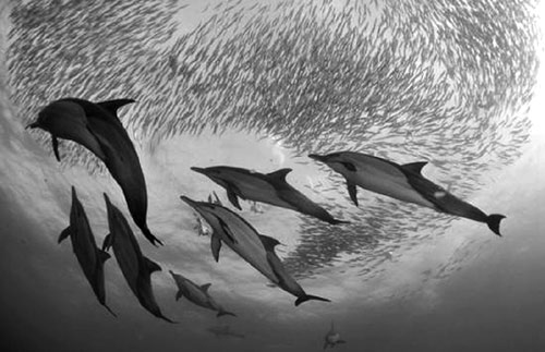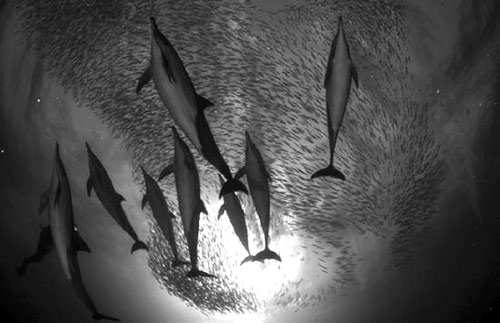 宽吻海豚比普通海豚更擅长打心理战,它们会在沙丁鱼群周围不停游动,像牧羊犬一样让这些猎物陷入恐慌。