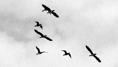 鸟儿们总在天空飞来飞去,没有点绝招来保存气力,很快就会累坏。于是,它们在做长距离飞行的时候,常常以“V”字形编成队形。飞行在前面的鸟儿拍打几下翅膀,会产生上升的旋流,后面的鸟儿便可以乘着这股气流滑翔。前面的鸟儿飞累了,后面的鸟儿就会和它交换位置,相互之间扶持飞行,这样能大大节省能量。据测算,排成“V”字形的群飞鸟类,比单只鸟展翅独飞可节约能量70%。科学家称其为“廉价飞行”。