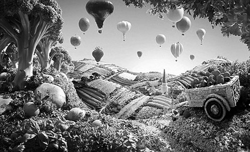 蓝蓝的天空上,挂着一个个由苹果、芒果、草莓、香蕉、大蒜、柠檬和酸橙雕刻而成的热气球,透过山坡上郁郁葱葱由椰菜、罗勒和香草制成的树木和小草,可以隐约看见由土豆、坚果和胡萝卜做成的岩石、小道和农舍,与用面包框加装蘑菇轮子制成的手推车相映成趣。
