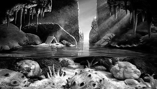 湛蓝的海水把洞穴隔成两个世界,强烈的色彩对比让洞穴更显神秘,用花椰菜、角瓜和蜗牛构建的海底世界显得那么宁静,而用稻米和意大利通心粉画成的暗礁又隐藏杀机。水面上,面包搭成山岩洞壁,胡萝卜做的石钟乳从岩壁悬挂下,栩栩如生,一派奇特景观。