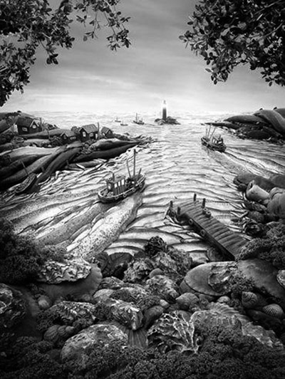 用海鲜来打造一幅海景画是最好的选择。海岸边的美景用牡蛎、扇贝和螃蟹构成,湛蓝的海水由鲭鱼和鲱鱼打造,远处的海岸线则用鳕鱼和鲱鱼制作,百里香竖立成绿色树木,正在行驶的船只是用葫芦雕刻而成,一片嫩豌豆却成了小船的桅杆。这幅由海鲜全家福绘就的渔船出海图,真是妙不可言。