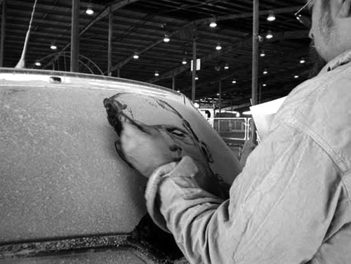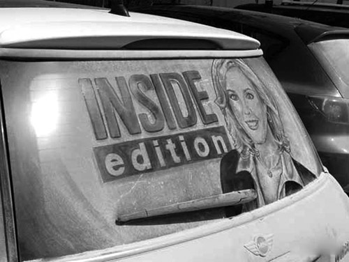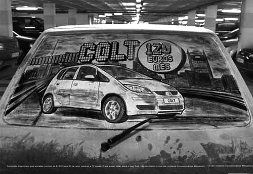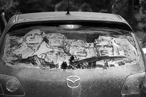 艺术家ScottWade一天突发奇想,把自己汽车的脏车窗当做了画布,在上面留下了一幅幅精美的画作。这些画丝毫不逊色于在那些画布上的作品,虽然因为要洗车,或下雨等因素,这些艺术作品生命显得有点短暂,但仍然受到很多人的追捧,也许这就是特殊画作的魅力所在吧。