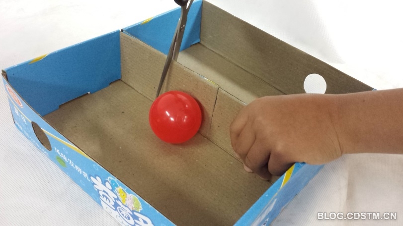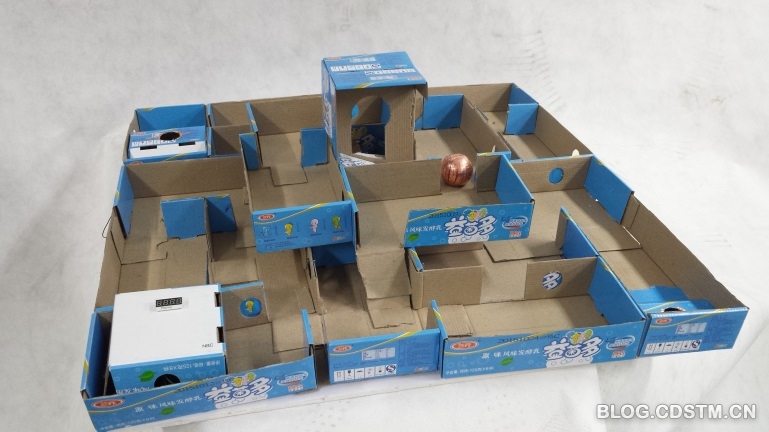 根据迷宫线路设计标记,使用剪刀和美工刀配合,参考球的直径,将酸奶盒剪开豁口,然后使用热熔胶枪将结构固定。需要注意的是,在酸奶盒的边缘有圆孔,在涂胶时要避免热熔胶从圆孔漏出,发生烫伤危险,最好戴上隔热手套进行防护。