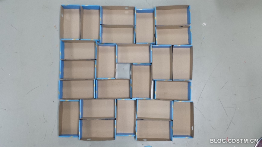 将酸奶盒排成宽度为1m左右的方形,这样的大小适合2~4人共同游戏,酸奶纸盒较软,若想做得更大,则需在底部加衬板避免变型,建议边长最大不超过1.2m。