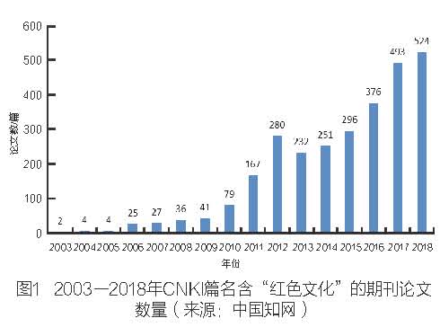 随着人民生活水平的提升,红色旅游在国民生活中的地位越来越突出,红色文化和红色文化遗址研究也逐渐受到了学者的关注。21世纪以来,研究红色文化的学者逐渐增多。截至2018年12月,在中国期刊全文数据库(CNKI)以“红色文化”为篇名检索发现期刊论文共有2 843篇,其中,硕博论文254篇。除1965年发表了一篇文章外,自2003年关于红色文化的文章才再次出现,而且基本呈增长态势,2018年更是突破了500篇,可见红色文化研究势头火热(图1)。