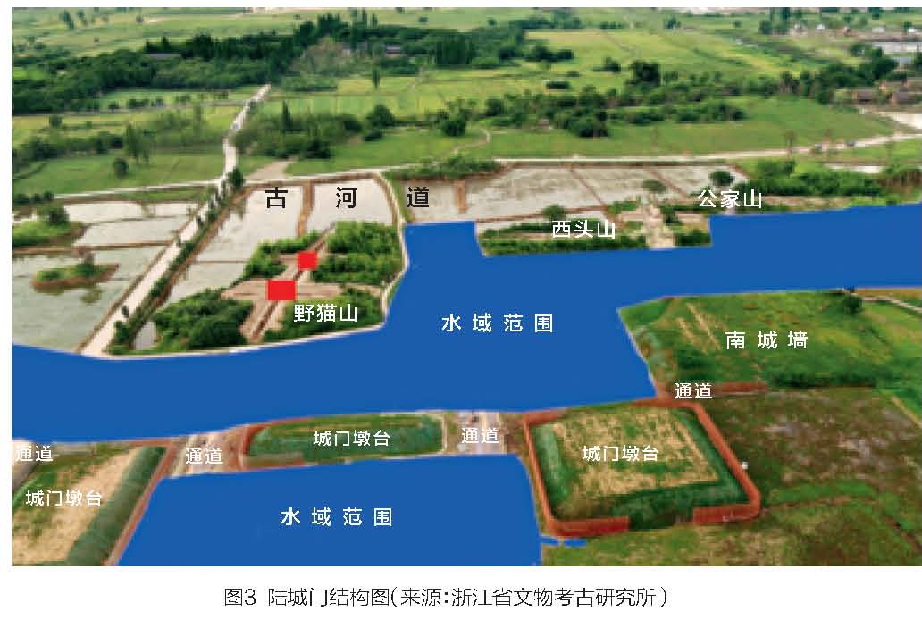 2019年,为了配合陆城门展示,对陆城门进行了长探沟发掘。遗憾的是,由于历年的破坏,城门内的3处门墩仅存高度不足1.5 m,其上未发现建筑遗迹。但发掘证实陆城门内外均为人为挖低后形成的湿地水域,当时并不存在联通城内外的南北向陆上通道,显然不具备以往我们所推测的陆城门功能。湿地水域范围内仅发现良渚晚期后段堆积,推测陆城门在建成后很长时间内是作为仪式性而非实用性城门(图3)。