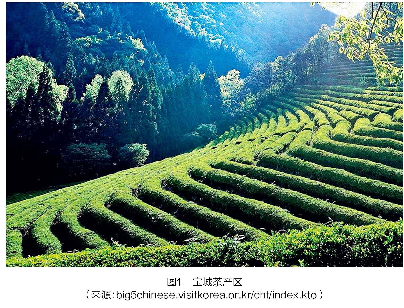 根据Dongguk Yeoji Seungram和Sejong Silokji的记载,宝城自古以来就生有野生茶树,因此生产绿茶,甚至这个村庄的名字也叫“茶田”,Songgok-ri和Nyangnyang-myeon均认可这一记载。目前,茶树仍在全县范围内种植,包括Mundeok-myeon的大源寺(Daewonsa Temple)和Beolgyo的金光寺(Jinggwang Temple)。现在的宝城茶园(图1)创建于1939年, 此地为海洋性和大陆性的混合气候,良好的土壤和合适的降水量非常适宜茶树种植,具备优质绿茶的生产条件。于是当年,人们便在土壤酸度合适的山脚下(原Hakseongsan 山)开辟了30 hm2的茶园。该茶园规模曾一度达到590 hm2。近年,茶园将面积达425 hm2的梯田茶种植园与自然景观融为一体,其绿茶产量约占全国绿茶产量的40%。