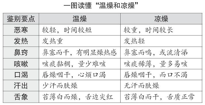 点评:古人说,“天气通于肺”,外界的燥气通过口鼻,直达肺脏。肺受到干燥刺激,就会咳个不停。但燥邪在肺卫表证阶段,有温凉之分。如果不分青红皂白,一律以清凉之物润燥,反而可能加重咳嗽。