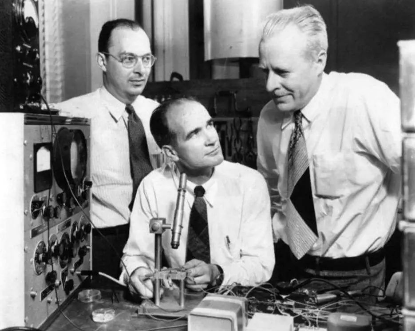 贝尔实验室让另一名科学家威廉·肖克利和巴丁、布拉顿组成半导体研究小组,三人在1947年研制出了晶体管。这就是后来引发一场电子革命的“晶体管”。这是一种用以代替真空管的电子信号放大元件,是电子专业的强大引擎,被媒体和科学界称为“20世纪最重要的发明”。因为发明晶体管,肖克利、布拉顿和巴丁分享了1956年诺贝尔物理学奖。