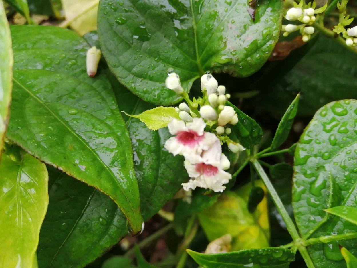第一次听说这个名字时,觉得那么娇柔的花儿,埋没了它的魅力。鸡屎藤花,一簇簇聚在一起开,淡红色的喇叭花型,白色的裙衣裹着中间一抹紫色,清秀淡雅,与它的名字以及叶子的臭味极不相称。