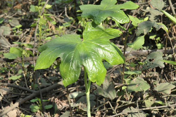 它的根茎粗壮,横生,有明显的碗状节。茎单一直立,茎上生长着1~2片叶子,像盾一样,叶片近圆形,6~8裂。