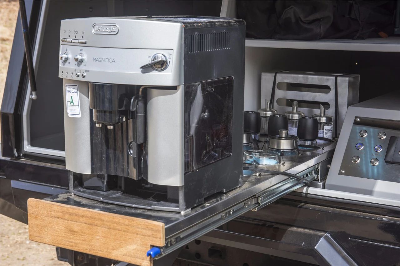 此外其拥有120升净水箱,专用热水系统和户外淋浴花洒,户外洗澡极其方便。在电力供应系统支持下,随车电视、咖啡机、抽拉式厨具等随时随地带来野外舒适享受。