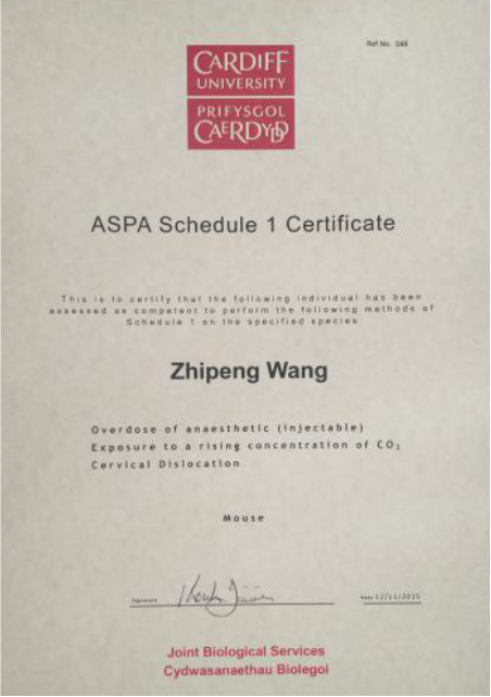 英国实验动物协会颁发的动物实验许可证书