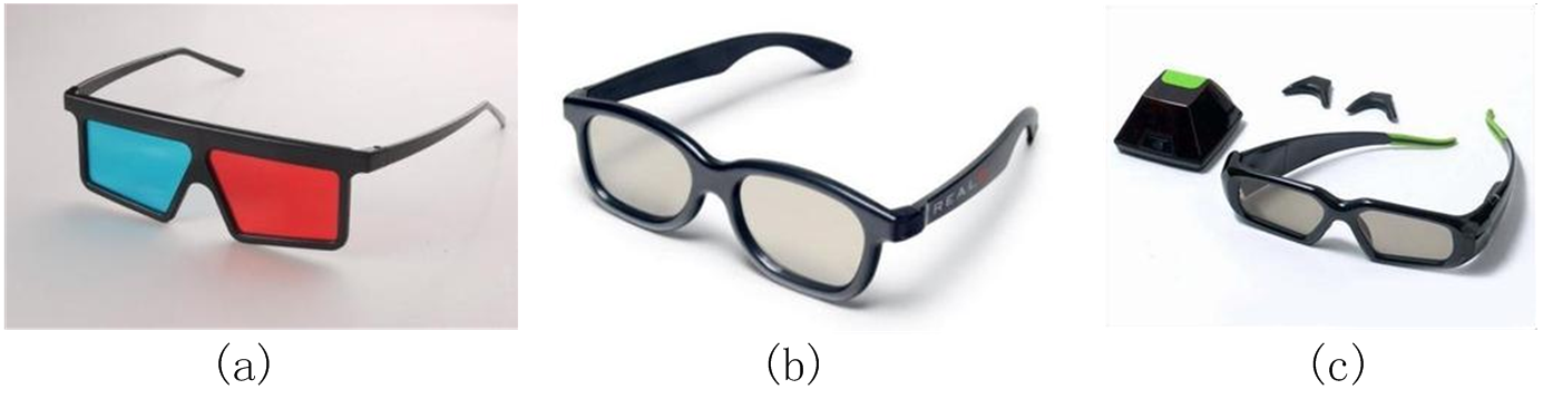 穿戴式立体显示包括助视式立体显示技术与头盔式显示技术。助视式立体显示技术是指需要佩戴辅助眼镜才可以观看3D的显示方式,它利用双目视差的原理为人脑带来立体感。根据助视式立体设备分光原理的不同,我们可以将其分为分色3D显示、偏振光3D显示和快门3D显示三种,这三种显示方式分别对应了图6中的三种不同立体眼镜。