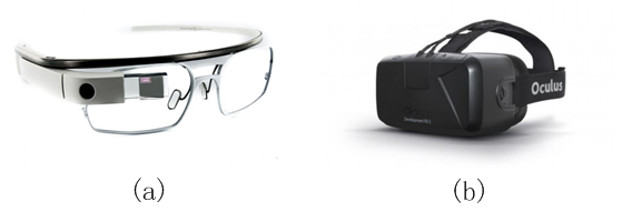 头盔式3D显示技术是将显示设备集成在头戴设备上,并通过波导或者透镜将3D图像呈现在眼前。根据应用的不同我们可以将其分为增强现实显示与虚拟现实显示两种。增强现实显示是指可以将3D信息与真实场景相互融合的显示技术,代表设备是谷歌眼镜,如图7(a)所示。虚拟现实显示是指可以让观看者完全沉浸在虚拟3D场景中的显示技术,代表设备是Oculus的虚拟现实头盔,如图7(b)所示。