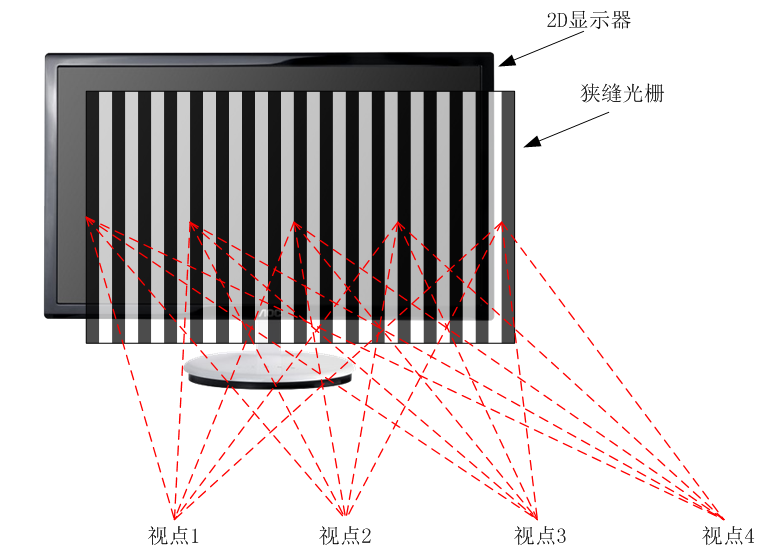 通过设计狭缝光栅透光条与遮光条的宽度、控制2D液晶显示器与狭缝光栅之间的距离,可以实现对裸眼3D显示设备观看距离与视点间距等参数的控制,从而满足观看者正确观看立体视差图像的需求。