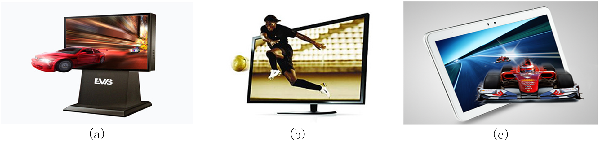 图13 不同尺寸的光栅立体显示设备(a)85寸立体广告机(b)55寸家用立体电视(c)10寸立体平板