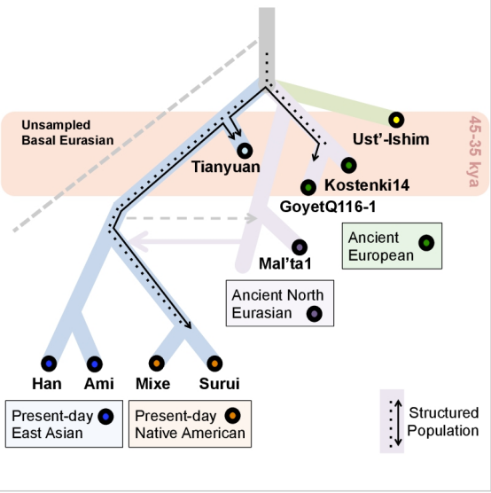 结合其他研究,在旧石器时代晚期,欧亚大陆至少存在4个以上的人群。一个是3.7万年前的早期欧洲人类,一个是4万年前的田园洞人,还有4.5万年前和4万年前的两个北亚人群,但是在现代人类中,没有留下这两个北亚人群的任何基因。