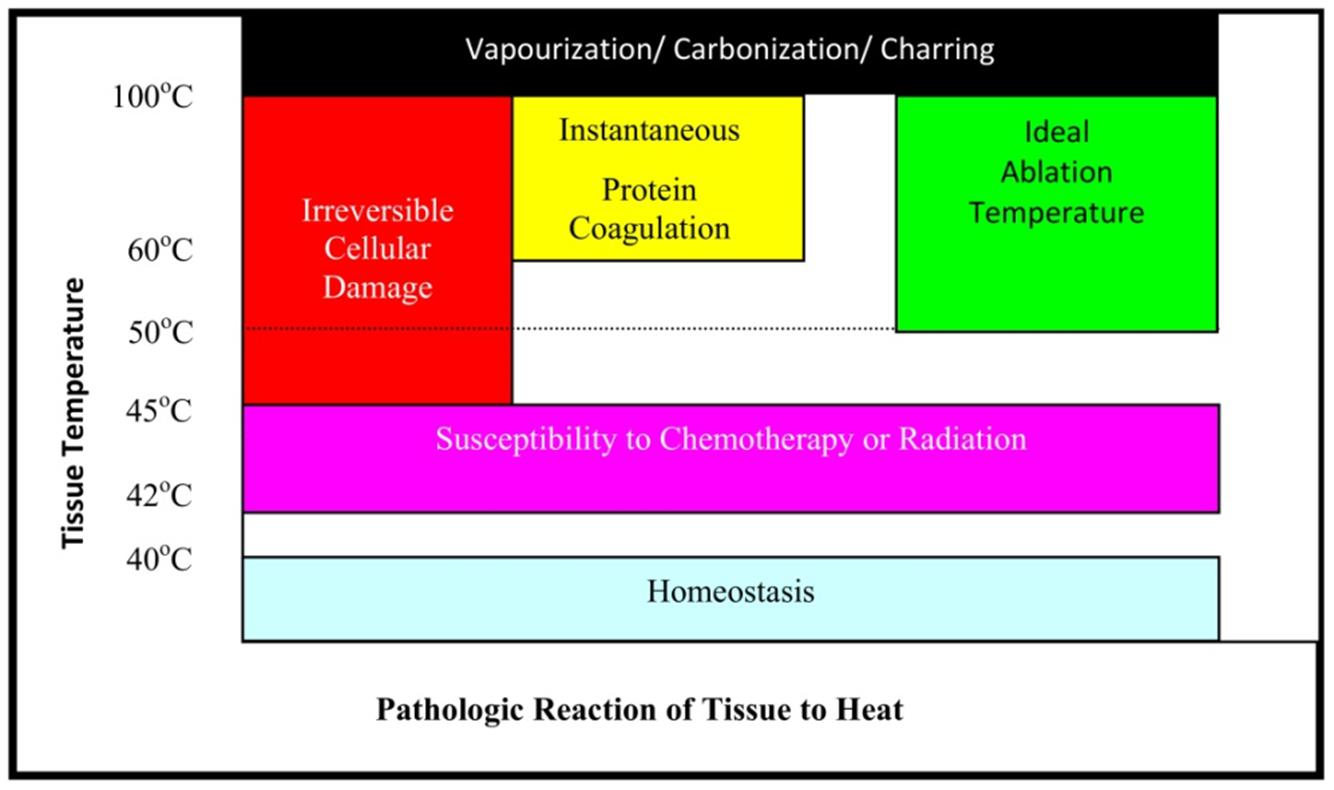 组织的热效应和温度直接相关:43℃以下不造成任何永久性损伤(蛋白可逆变性);43~55℃可破快脂质双分子层和膜转运蛋白,而造成细胞坏死和凋亡;高于57℃可造成组织瞬时凝固坏死;超过80℃可造成组织脱水;超过100℃则可导致细胞膜破裂“爆米花效应”,组织气化、焦痂或碳化。组织间质激光治疗的温度应控制45~80摄氏度之间。