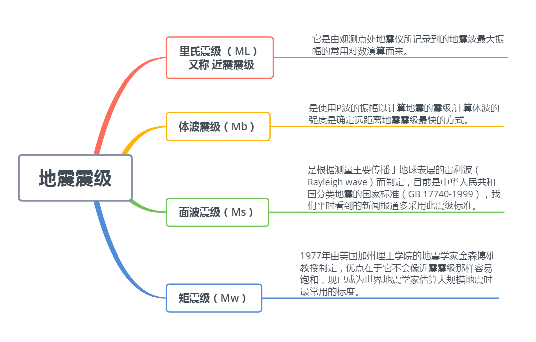 这是因为测量震级的标准不同所致,采用不同的计量方式就可能得到不同的数字。一般地震震级可分为里氏震级(近震震级)、体波震级、面波震级、矩震级四类,如下图。