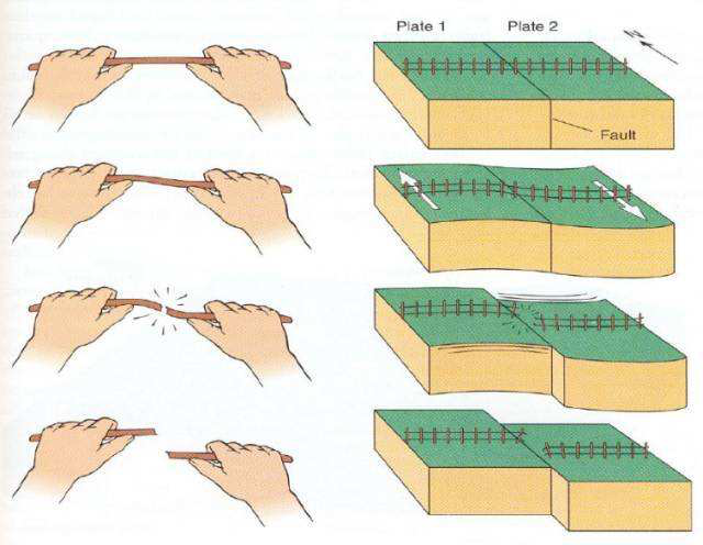 关于构造地震的形成,可以理解为一个人在掰一根木棒,刚开始用力时,木棒会发生弯曲,弯曲幅度小处在弯而不断的状态;但力气逐渐加大时,木棒会突然被掰断,那一瞬间便是“地震”,想想看,木棒掰断那下是不是有声音?声音就是震动,它会在空气中产生震动波,传到耳朵里。地震发生时,断层“掰断”那个瞬间也会产生震动波,在地下岩石中传播,叫做地震波,它从震源(也就是掰断的位置)传播到远处的地面上,被人所感知。