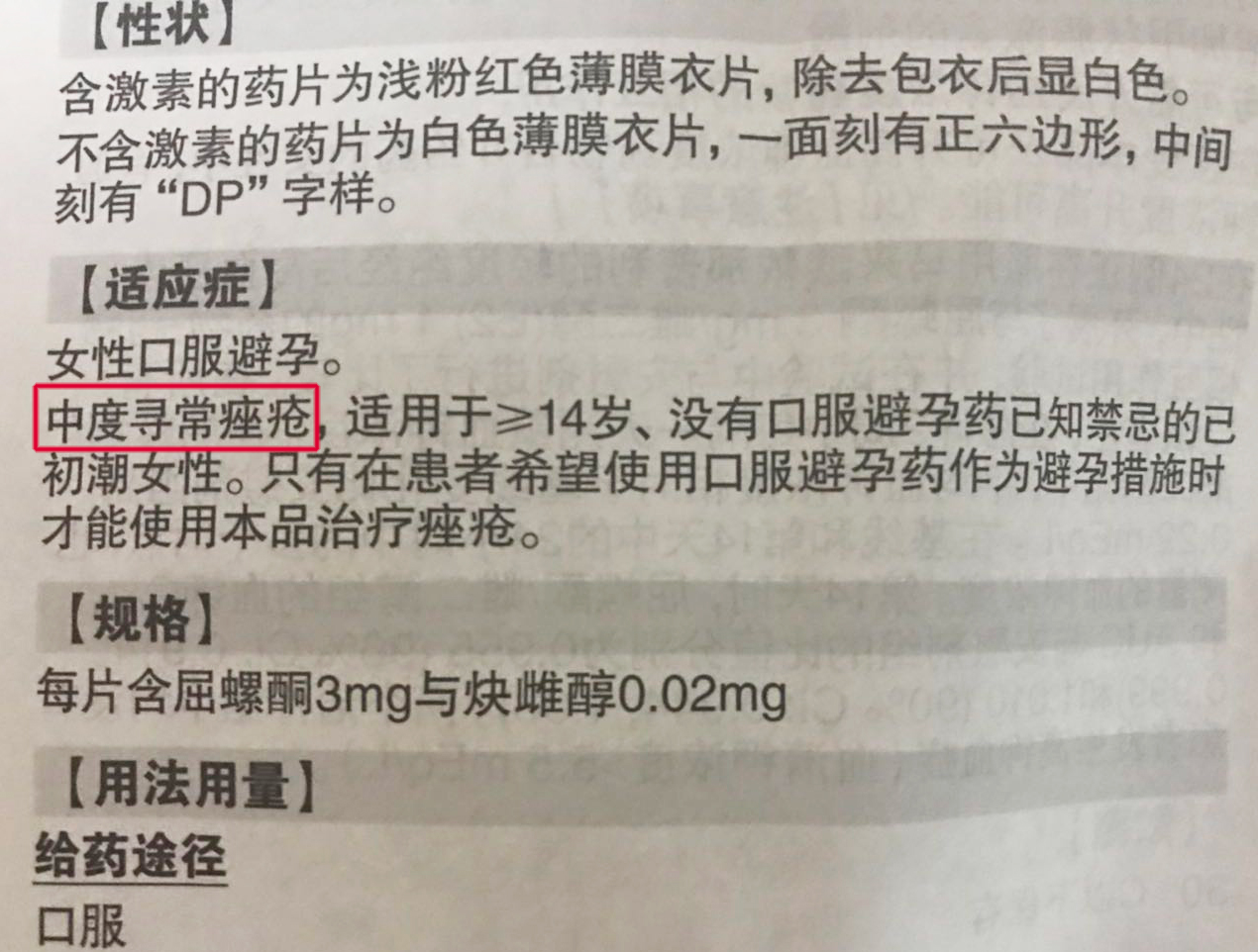 这里的“有些避孕药”指的是短效避孕药,因为长效避孕药不良反应较多,紧急避孕药更是会对女性身体造成很大伤害(服用次数一年不要超过3次,一个月不要超过2次)。临床上治疗痘痘,一般都选用短效避孕药。下面这张图就是某短效避孕药的说明书,适应症清楚地写着“中度寻常痤疮”: