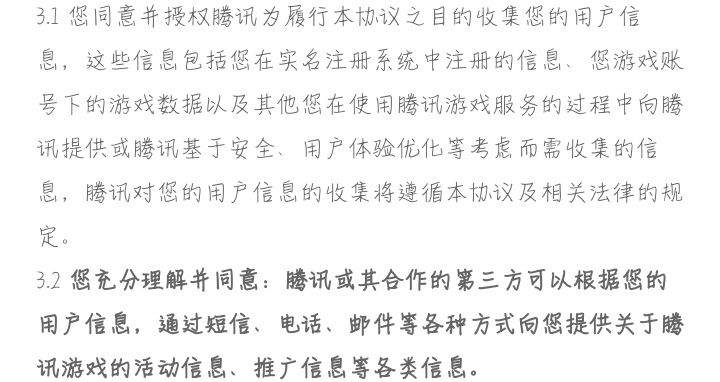 在腾讯游戏许可及服务协议中,关于个人信息的部分有:腾讯将会收集用户在实名注册系统中注册的信息、游戏账号下的游戏数据以及用户在使用腾讯游戏服务的过程中向腾讯提供过腾讯基于安全、用户体验优化等考虑而收集的信息,而腾讯或其合作的第三方可以根据用户信息通过短信、电话、邮件等各种方式向用户提供关于腾讯游戏的活动信息、推广信息等各类信息。在这份协议中,腾讯表示,除本协议另有规定外,腾讯游戏服务对用户信息收集、使用及保护等将遵循腾讯统一公布的相关隐私政策。而这份隐私政策在安装时附在服务协议之后,需要翻阅完服务协议才能看到。根据腾讯隐私政策,腾讯会收集的信息包括设备信息、软件信息、IP地址等等,对于位置信息的收集显得格外奇怪,因为“您或其他用户在使用服务时提供的信息中可能包含您所在地理位置信息,例如您提供的帐号信息中可能包含的您所在地区信息,您或其他人共享的照片包含的地理标记信息”也会被腾讯记录下来。尽管腾讯同时也说明了这些信息存储的地点和期限,而且强调了会保护用户的信息安全,但是知情与不知情的情况下,使用app的感受是不一样的。