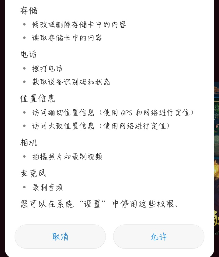 除了隐私合同,在安装运行app前,还会有相关权限请求获得许可。比较常见的有存储权限、电话权限、获取位置信息、使用麦克风录音、使用相机拍摄照片录制视频等等。