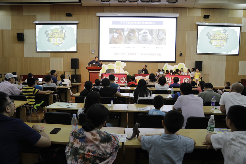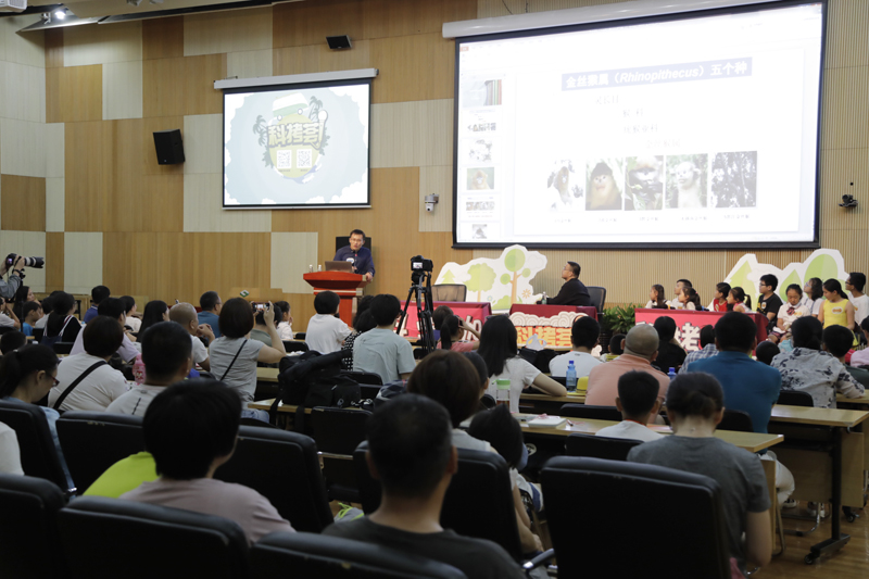 赵博士首先向大家总体介绍了世界上存在的五种金丝猴——川金丝猴、滇金丝猴、黔金丝猴、越南金丝猴和怒江金丝猴(又称缅甸金丝猴),接着重点讲述了科考过程当中与滇金丝猴打交道时或妙趣横生、或危机四伏的一系列故事,让在场的大朋友小朋友们仿佛身处白马雪山、茂密丛林,随着科考人员一同找猴、抓猴、观察猴。科考不仅有欢乐与惊喜还有拔山越岭的辛苦与危及生命的险境,当赵博士讲述到自己骑马过湍急的河流遇险侥幸脱难,而自己的同事在相似的情况下不幸罹难的时候,现场陷入一片沉默。正是日日夜夜的守望与不畏艰辛和危险的青春才换来了科考人员对金丝猴社会结构、活动规律、进化机制的深入了解,才换来了人类对自然界一次次飞跃式的认知革命。