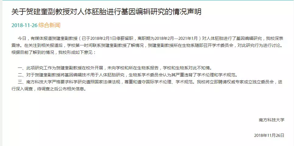 11月26日,南方科技大学生物系副教授贺建奎宣布,一对名为露露和娜娜的基因编辑婴儿,于2018年11月在中国健康诞生。“这对双胞胎的一个基因经过修改,使她们出生后即能天然抵抗艾滋病。这是世界首例免疫艾滋病的基因编辑婴儿,也意味着中国在基因编辑技术用于疾病预防领域实现历史性突破。”这一消息甫一经披露,便引起了广泛关注。深圳市医学伦理专家委员会于当天下午发表声明,称将启动对该事件涉及伦理问题的调查。南科大也发出声明表示,自2018年2月1日已对贺建奎停薪留职,“此项研究工作为贺建奎副教授在校外开展,未向学校和所在生物系报告,学校和生物系对此不知情。”