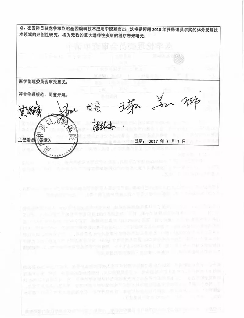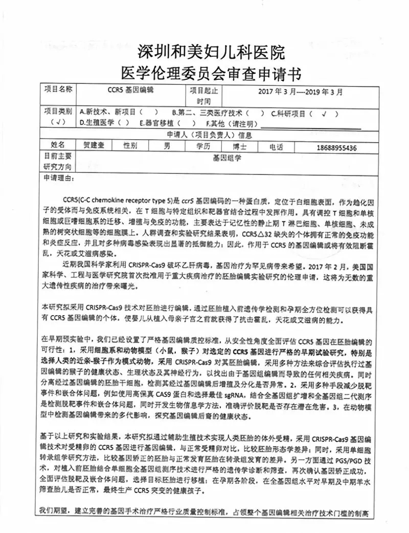 即使排除实验中可能出现的各种风险,这项研究本身对伦理的挑战都是巨大的。从中国临床试验注册中心网站信息来看,正式名称为《基因编辑人类胚胎CCR5胚胎基因编辑安全性和有效性评估》的此项研究课题的实施地点为深圳和美妇儿科医院。网站显示,该研究于2017年3月7日通过了深圳和美妇儿科医院伦理委员会的伦理审查,并公布了由该院多位伦理委员会委员签字同意的《伦理审查申请书》。然而该医院如今却否认与贺建奎合作,并表示对他的研究毫不知情。深圳市卫生和计划生育委员会同时也表示,深圳市参照《涉及人的生物医学研究伦理审查办法》对省级医学伦理专家委员会的相关职责要求,建立了“深圳市医学伦理专家委员会”,并已开展“从事涉及人的生物医学研究的医疗卫生机构已设立伦理委员会的备案工作”。根据《涉及人的生物医学研究伦理审查办法》第十四条的规定:“医疗卫生机构应当在伦理委员会设立之日起3个月内向本机构的执业登记机关备案”,深圳和美妇儿科医院医学伦理委员会设立后本应按要求进行备案。但是经查证后,该机构并没有进行备案。不管是为了瞒天过海,还是纯粹失误,这项研究课题的进行违背了规定的程序是毋庸置疑的。