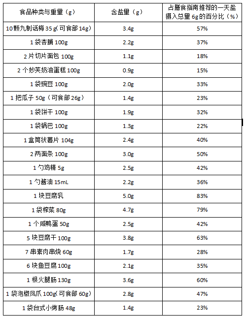 很多人都喜欢吃起来香香的零食,而这些食品之所以香,也是因为加了“咸”才凸显出来的。超市中琳琅满目的瓜子、兰花豆、青豆、盐焗干果、薯片、锅巴、五香豆腐干、火腿肠等都是藏盐大户。例如,吃进一大把瓜子(50克,可食部26克),就相当于吃了1.4克盐,已占到每天食盐推荐总量的23%;而如果吃上一根130克的火腿肠,则相当于吃盐3.6克,占到每天吃盐总量的60%。